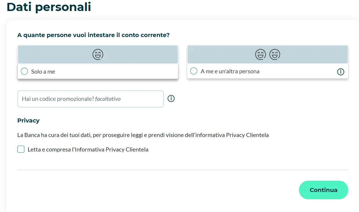 Dopo aver avviato la procedura di apertura dal sito ufficiale, la prima cosa che ti verrà chiesta è quella di scegliere la filiale presso la quale intendi aprire il conto. Subito dopo, dovrai scegliere se intestare il conto a te o anche a un'altra persona e proseguire con l'inserimento dei dati richiesti.