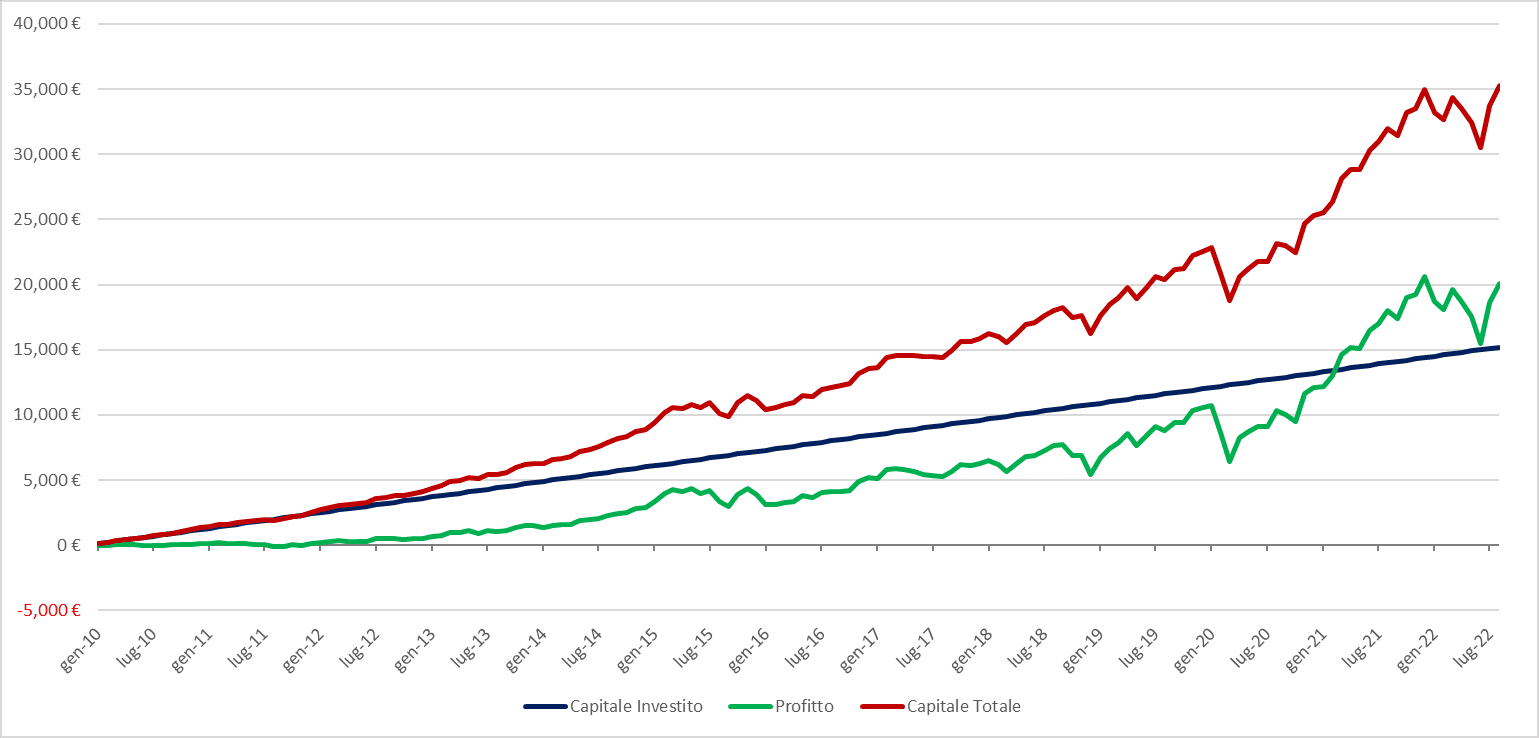 Ipotizzando di investire ogni mese una quota fissa di 100€ e senza considerare le commissioni che dipendono dal broker scelto, il valore totale dell’investimento al momento della stesura di questo articolo (settembre 2022) sarebbe di 35.270€ composto da 15.200€ di capitale investito e da ben 20.070€ di profitto.