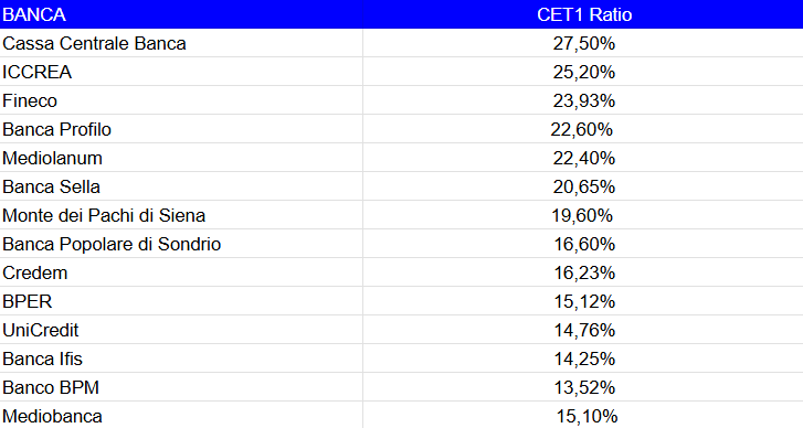 A tutte le banche di ogni Paese membro della UE, viene poi assegnato un CET1 minimo specifico che, nel caso dell'Italia, è in linea generale pari a 11,2%.